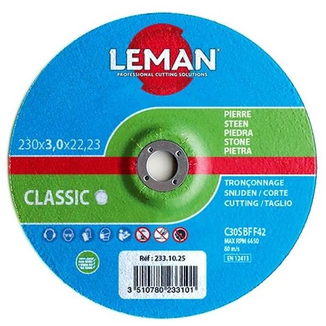 25 disques à tronçonner matériaux de construction, pierre – D. 230 x Al. 22,23 x Ep. 3 mm. EN 12413. 6650 tr/min. Carbure de silicium, résine, 2 toiles, coupe sans effort. Longue durée de vie, bonne finition de coupe. LEMAN propose des disques à tronçonner fabriqués dans le respect de la norme EN12413. Plusieurs types de disques à tronçonner, en fonction de l’application et des performances recherchées : métal, matériaux de construction, inox … Le marquage n’est pas obligatoire sur les produits. C’est un agrément donné aux fabricants qui respectent les normes EN12413, EN13236 et EN13743. C’est la garantie que la fabrication est réalisée en conformité avec les normes en vigueur.