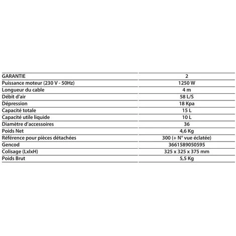 Caractéristiques techniques de l’Aspirateur eau et poussières Leman LOASP151 :