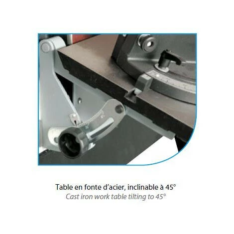 – Table en fonte d’acier inclinable jusqu’à 45° vers le bas, avec rainure pour utilisation du guide d’onglet.