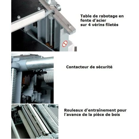 • Table de rabotage en fonte d’acier montée sur 4 vérins filetés et réglable en hauteur par une manivelle.
