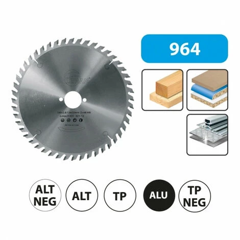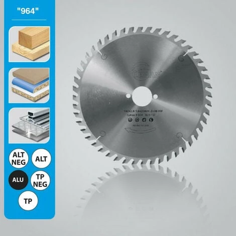 • Denture alternée pour le travail du bois, attaque négative pour scie radiale.• Denture TP pour un travail de finition dans le bois et les panneaux dérivés.
