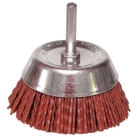 Lot de 10 brosses coniques pour meuleuse fil nylon pour décapage doux bois et métaux non-ferreux D. 75 mm – Q. 6 x 30 mm – Gr. 80. EN 1083-2. Nettoyage et polissage des bois et métaux non-ferreux. Idéal pour surface plane. 4 500 tr/min maximum.