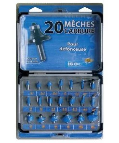 Fraises de défonceusesFraise de défonceuse à plaquettes carbure queue de 8 mm coffret de 20 Composition :Mèche à gorge 3,2 -6 -10 mm.Mèche à rainure en V 10 mm.Mèche à affleurer 30° -45°.Mèche queue d’aronde.Mèche pour oculus 6 mm.Mèche à affleurer 9,5