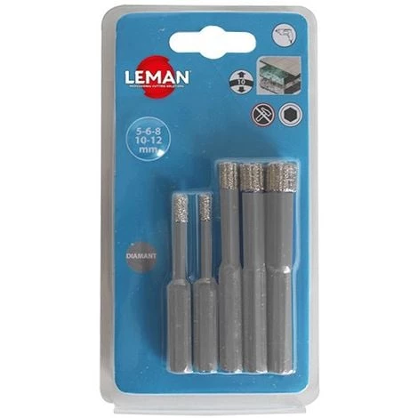 - Foret multi-matériaux : Lot de 5 forets diamantés grès cérame D. 5 / 6 / 8 / 10 / 12 mm à eau – 6500.05 – Leman